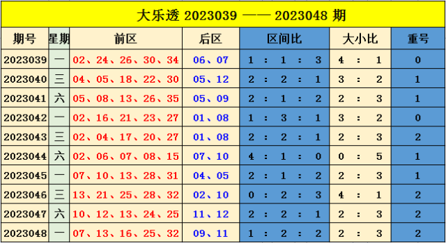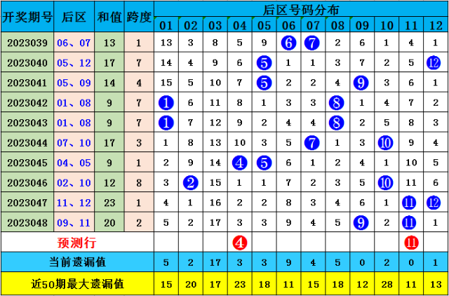 后区分析:上期开出的大大奇奇组合09、11,前十期后区大小比为12:8,大号码数量相对热出,其中小大组合占6期。本期预计小大组合出现,后区推荐号码04、11。