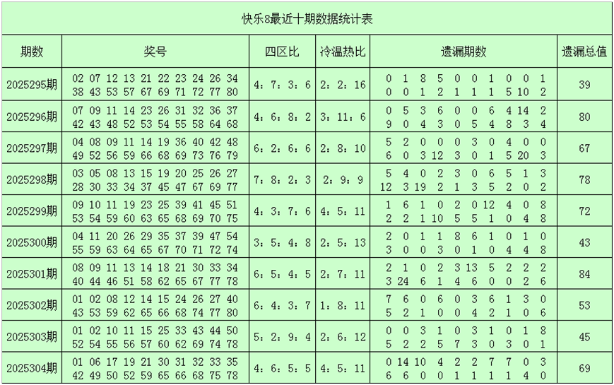 一、快乐8第2025305期奖号分析(定义:遗漏0-2期号码为热码,遗漏3-6期号码为温码,遗漏7期及7期以上号码为冷码,重码为上期开出奖号,邻码为上期没有出现,但与上期奖号差值为1的号码,例如上期开出奖号04,没有出现号码03和05,则本期03和05都为邻码,其它则为孤码。