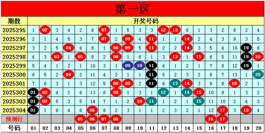 目前第一区包含11个热码:重码4个01、06、17、19,邻码1个02,孤码6个08、10、11、12、14、15;包含7个温码:邻码3个05、18、20,孤码4个03、04、09、13;包含2个冷码:邻码2个07、16,孤码0个;号码冷温热个数比为2:7:11,重号、邻码、孤码个数比为4:6:10。