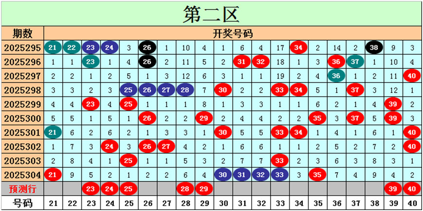 目前第二区包含11个热码:重码6个21、30、31、32、33、35,邻码0个,孤码5个24、25、26、27、40;包含6个温码:邻码2个29、34,孤码4个23、28、37、39;包含3个冷码:邻码2个22、36,孤码1个38;号码冷温热个数比为3:6:11,重号、邻码、孤码个数比为6:4:10。
