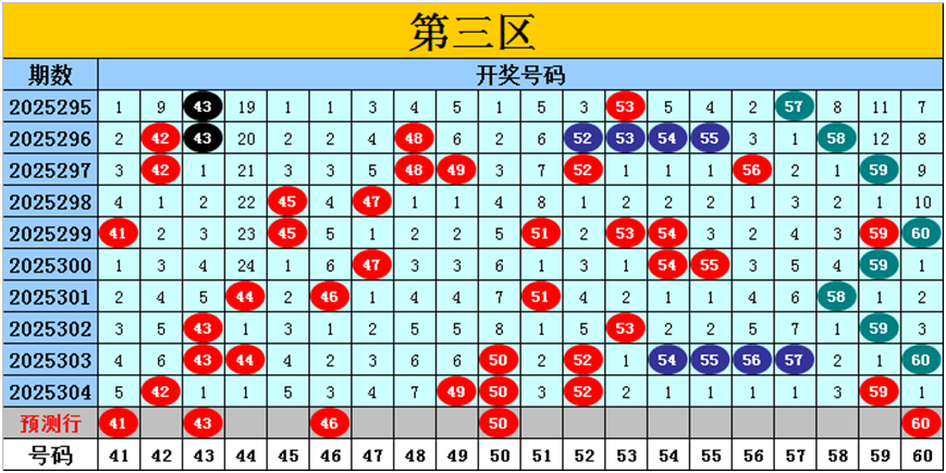 目前第三区包含13个热码:重码5个42、49、50、52、59,邻码3个43、53、60,孤码5个44、54、55、56、57;包含6个温码:邻码3个41、51、58,孤码3个45、46、47;包含1个冷码:邻码1个48,孤码0个;号码冷温热个数比为1:6:13,重号、邻码、孤码个数比为5:7:8。