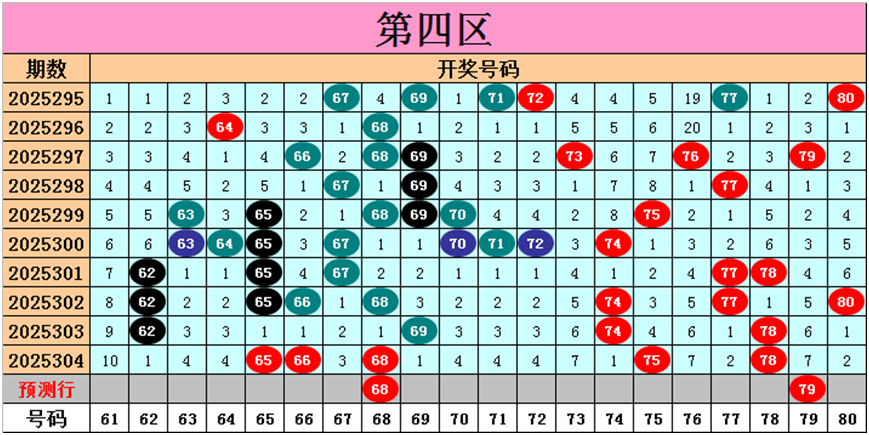 目前第四区包含10个热码:重码5个65、66、68、75、78,邻码3个69、74、77,孤码2个62、80;包含6个温码:邻码2个64、67,孤码4个63、70、71、72;包含4个冷码:邻码2个76、79,孤码2个61、73;号码冷温热个数比为4:6:10,重号、邻码、孤码个数比为5:7:8。