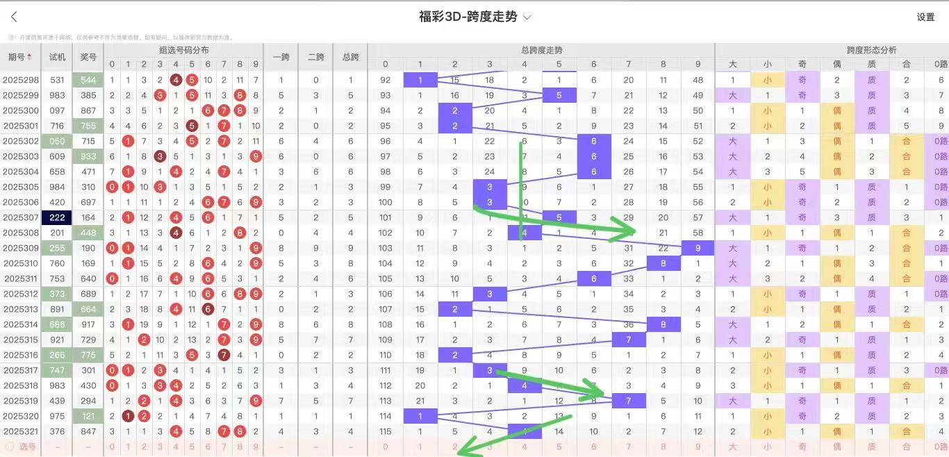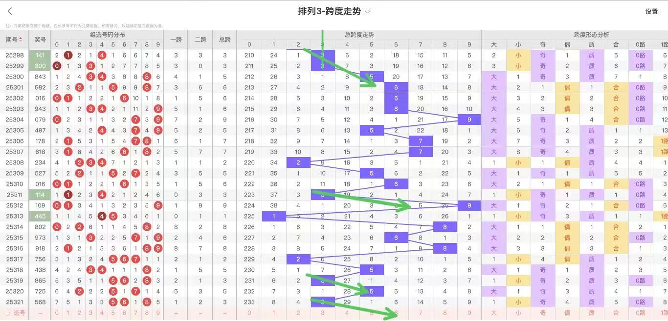 10期内跨度走势为:9-1-8-6-8-2-5-3-5-3,10期内大小跨比:6:4,奇偶跨比6:4,百期内跨度3共开出的16次,下期数据:6 2 7 5 6 7 9 2 8 4 5 3 5 9 5近期度较热,考虑跨度3开出后容易出大跨度,近期大小规律下大:偶:合,所以接下来继续大跨,偶跨度表现!