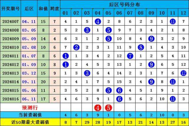 上期后区中奖号码为06 11,近10期后区综合奇偶比14:6,奇偶数出号奇数占优,本期推荐偶奇组合04 05: