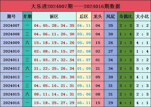 大乐透2024016期开奖:前区15 18 25 27 29,后区06 11。龙头:15,凤尾29,奇偶比为4:1,大小比4:1。