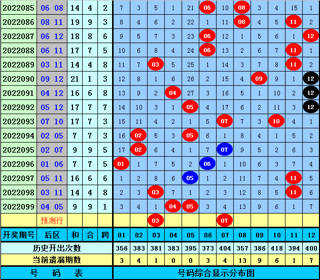 后区分析:上期后区开出1路+2路奖号04+05,最近10期后区奖号012路比为6:6:8,本期看好开出0路号码和1路号码,两码参考03、07。