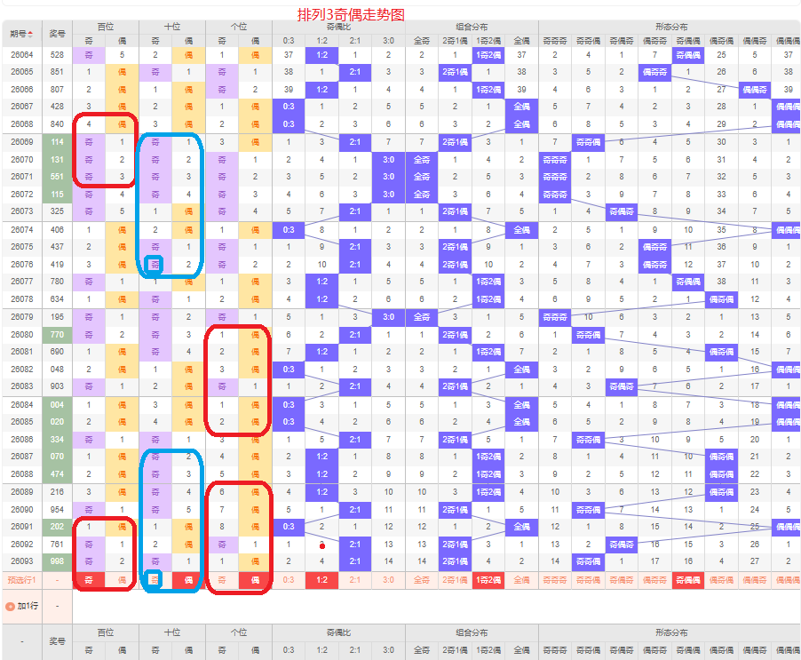 上一期的奇偶比为2:1,两奇的号码组合,从近五期的奇偶数出现情况看,奇数出7次,偶数出现8次,奇数偶数号码出现较平均,本期要侧重两偶的号码组合,侧重奇偶偶或偶奇奇的号码组合,根据奇偶组合形态可做五码定位13579/02468/02468或02468/13579/13579