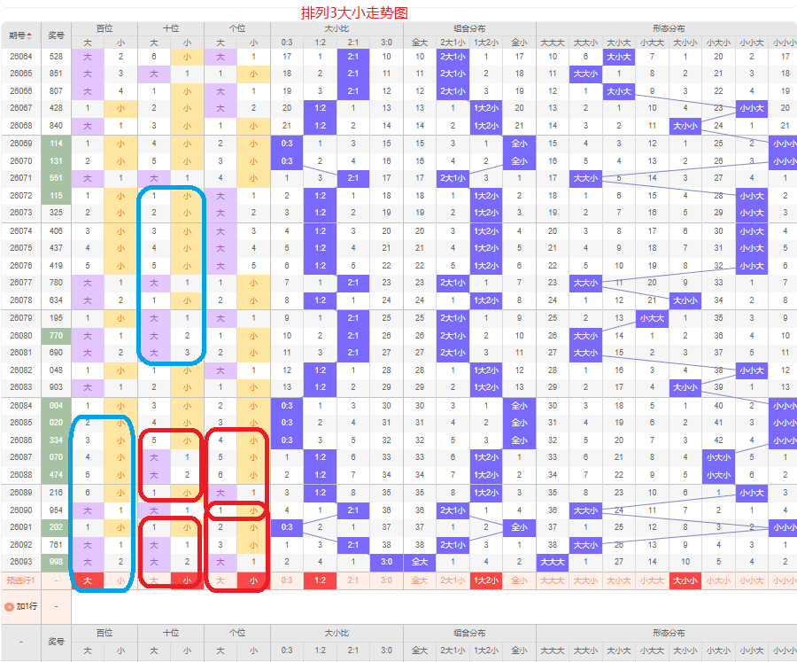 排列3第26093期开出的号码998,和值26,跨度1,奇偶比为2:1,大小比为3:0,012路个数比为2:0:1,组三的形态。