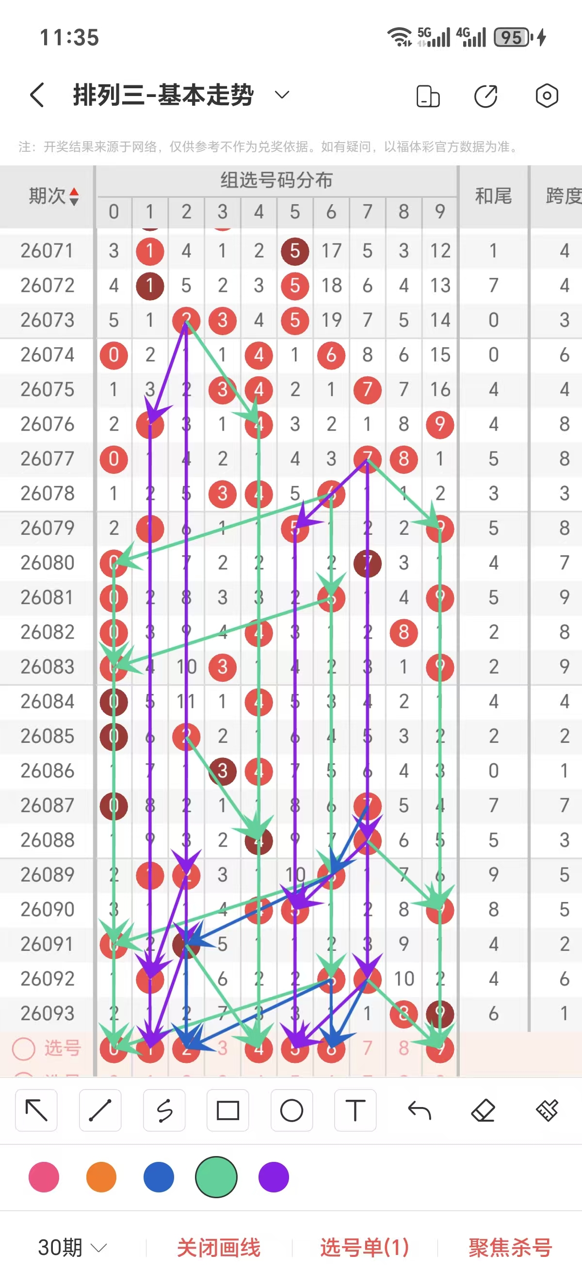 通常情况下在五期之内重复一个跨度的概率较高,近五期重复了5的跨度,近五期跨度为5/5/2/6/1,近期2路的跨度较热,本期要侧重3/5/9跨为主的号码组合。选择好跨度就可以从跨度方面选择相应的双胆码组合,双胆码的选取要根据近期和历史的走势进一步的分析选取。