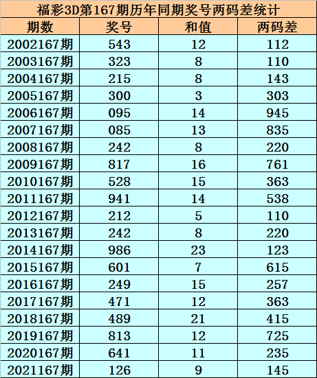 福彩3D第167期,历史上期开出20次奖号,其奖号分别为:543、323、215、300、095、085、242、817、528、941、212、242、986、601、249、471、489、813、641、126,奖号两码合差分别开出: