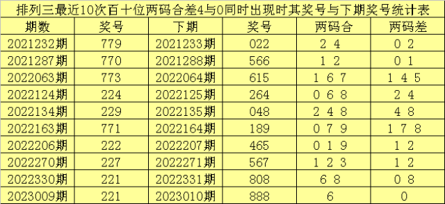 百十位合差分析:上期奖号百十位开出77组合,两码合为4,两码差为0,最近10次百十位两码合4与两码差0同时出现时,其奖号和下期奖号分别为: