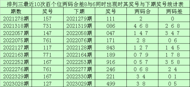 从以上统计可以看出,百个位两码合差8与6同时出现之后其下期两码合差表现最热的4个分别为:0128,本期百个位两码合差可以参考这四码中的数据。
