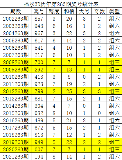 福彩3D历年第263期同期分别开出奖号:857、943、967、617、541、217、700、292、413、928、799、681、304、082、489、672、813、949、007、194,详细统计见下表: