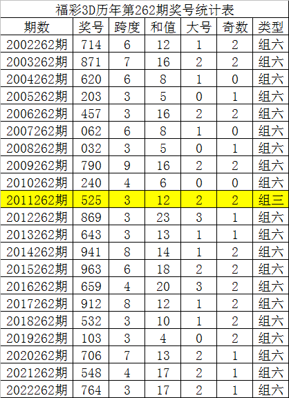 从以上统计可以看出,历年3D第263期开出了5次组三号码,开出了15次组六号码。组六号码出现概率大,本期预计开出组六号码。