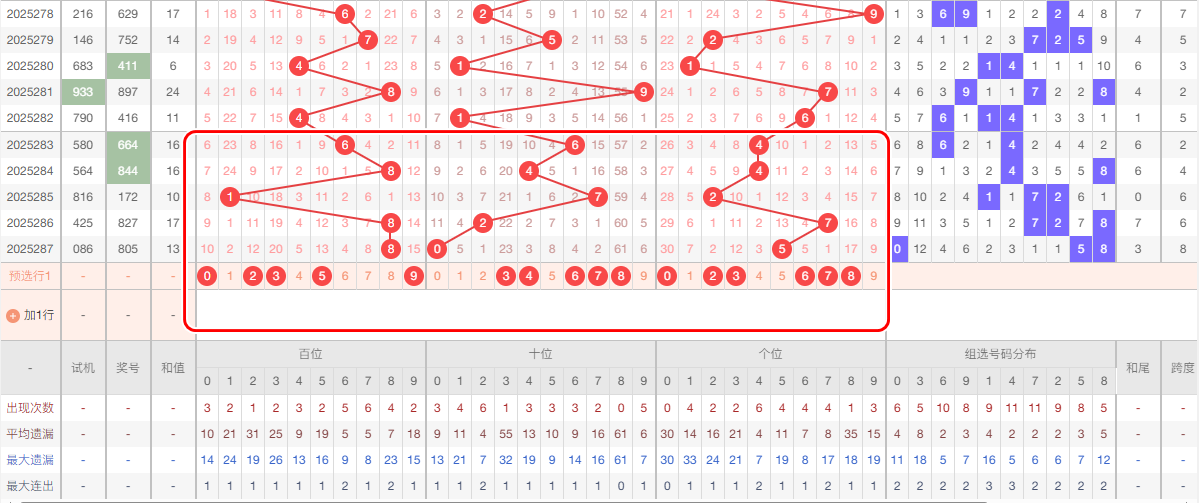 上期百位开出8,本区与上期的跨度为0,本期我们可以从上面走势图中看出选号的思路,本期百位推荐关注:02359