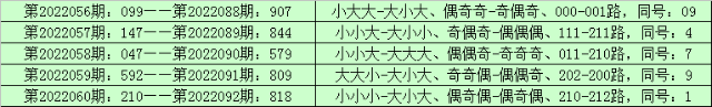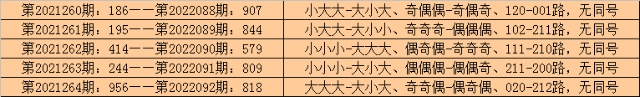 所以,排列三第2021265期奖号:095,与排列三第2022093期奖号可能没有同号。且排列三第2022093期奖号大小比、奇偶比和012路比不会与第2021265期奖号直选形态:小大大、偶奇奇和002路全部相同。