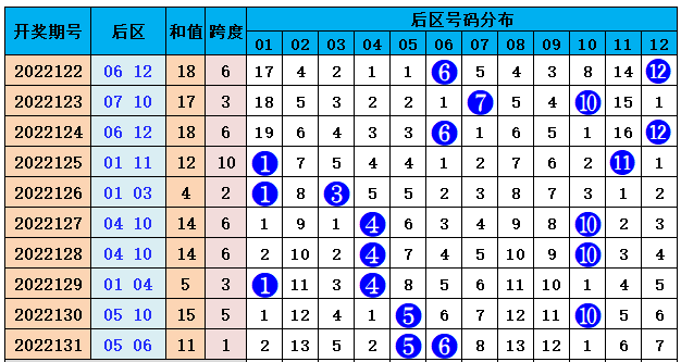 跨度分析:上期后区跨度为1,比前期下降4个点位,预测本期跨度变化上升,推荐两码跨度1--5