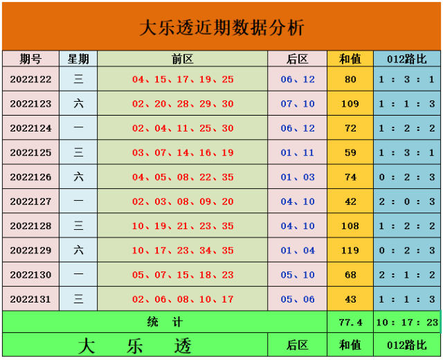 和值走势:上期奖号和值为43,近10期和值平均值77。4,上期和值小于平均和值,近十期内,7期和值在100以内,3期和值大于100,预测本期和值较上期升温,本期预测前区和值在95左右