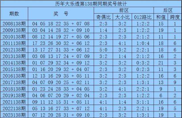 袁军师体彩大乐透第2024138期历史同期奖号分析: