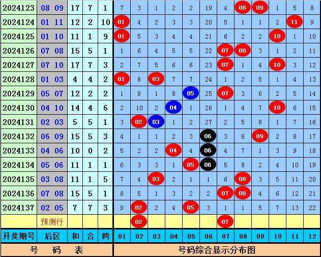 后区分析:在第138期历史同期开奖中,和值大小为10:5,跨度奇偶比为9:6,本期后区注意两码02和07。