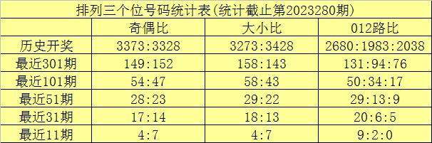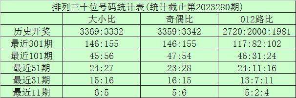 上期回顾:排列三第2023280期奖号为:601。奖号形态组六,大小比1:2,奇偶比1:2,012路2:1:0。
