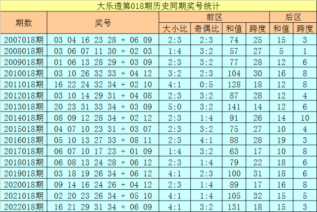 2、前区和值分析:在第018期历史同期奖号中,前区和值全部分布在57-141之间,和值大小比为7:9,奇偶比为11:5,最近三年同期和值开出89、105和131,今年第018期预计前区和值在70-79区段出现。