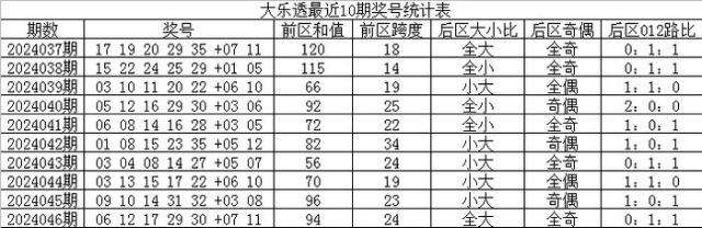 体彩大乐透第24046期开出奖号:06 12 17 29 30 + 07 11,其中,前区奖号首尾间距为24,和值为94,奇偶比为2:3,012路比为3:0:2,大小比为2:3。