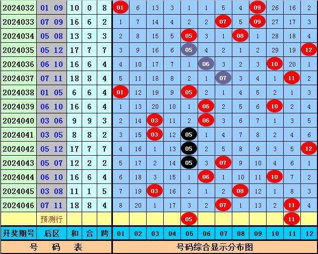三、后区奖号分析:最近十期后区分别开出奖号:07+11、01+05、06+10、03+06、03+05、05+12、05+07、06+10、03+08、07+11,其中后区号码奇偶比为13:7,大小比为7:11,012路比为7:6:7,本期后区排除0路号码,看好号码01、05、07、08、11。