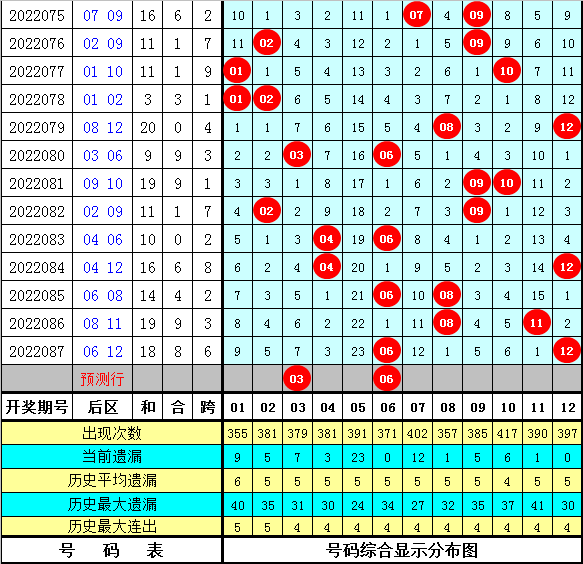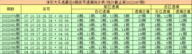 上期回顾:体彩大乐透第2022087期开出奖号为:04 06 10 24 28 + 06 12,其中前区各位奖号分别遗漏:0期、12期、0期、20期和0期,遗漏总值为32期,后区号码分别遗漏1期和2期,遗漏总值为3期。