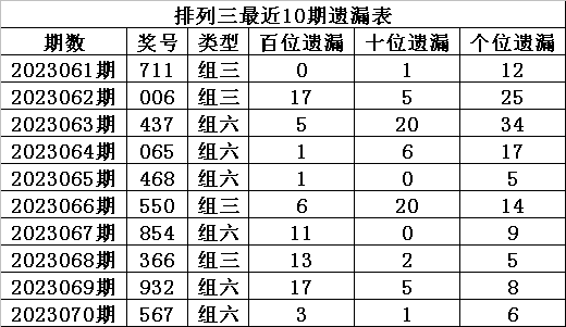 上期回顾:排列三第2023070期奖号:567,组六,直选遗漏总值为10期。