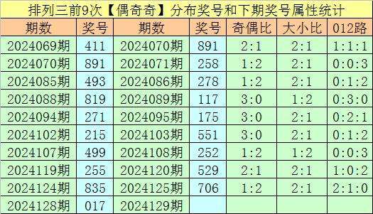 在最近9期开出奇偶分布:偶奇奇的奖号为:411-891-493-819-271-215-499-255-835,在下期出现号码分别为:891-258-278-117-175-551-252-529-706。其中百十个位号码分布情况如下: