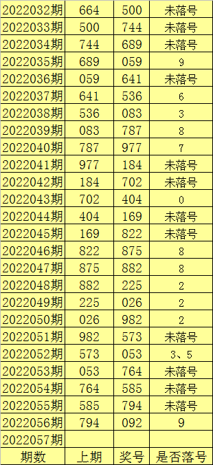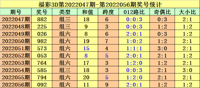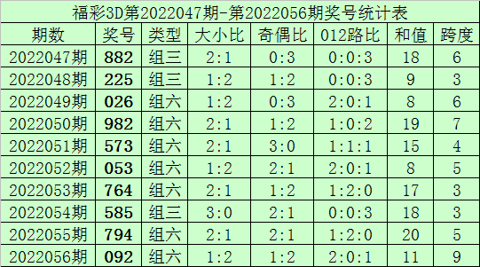 一、上期回顾:福彩3D第2022056期开出奖号092。