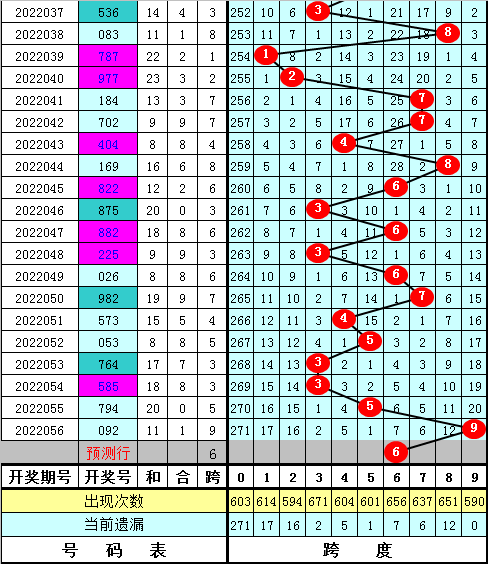 福彩3D第2022056期最大跨度开出9,近期最大跨度波动较大,本期预计最大跨度在4-8区段出现,最大跨度关注45678,精选跨度6。