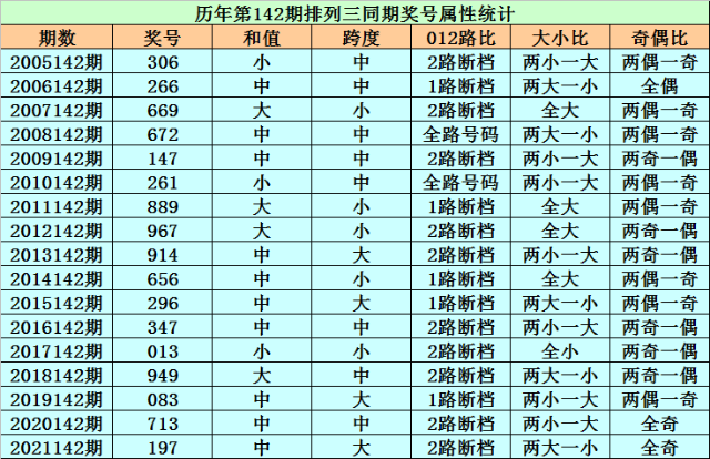 历史上第2022142期排列三已开出17期奖号了,历年同期奖号分别为:306、266、669、672、147、261、889、967、914、656、296、347、013、949、083、713、197,详细统计见下表:
