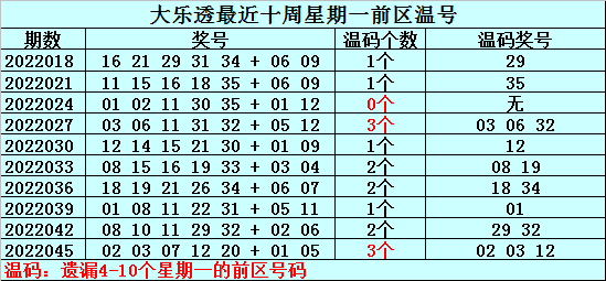冷号:最近十周星期一前区开出12个冷号,上周星期一冷号出现2个,本周星期一注意冷号13。