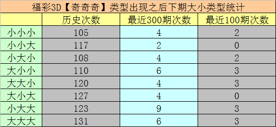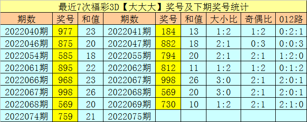一、福彩3D上期奖号为759,大小类型开出:大大大,历史上该大小类型奖号共出现942次,最近7次【大大大】奖号分别开出:977、875、585、895、968、998、569,其中组三号码出现3次,组六号码出现4次。