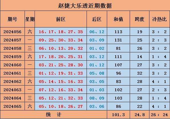上期回顾:前区05 10 18 26 27,后区03 06,当期前区号码和值86,跨度22,冷热比:4:1。