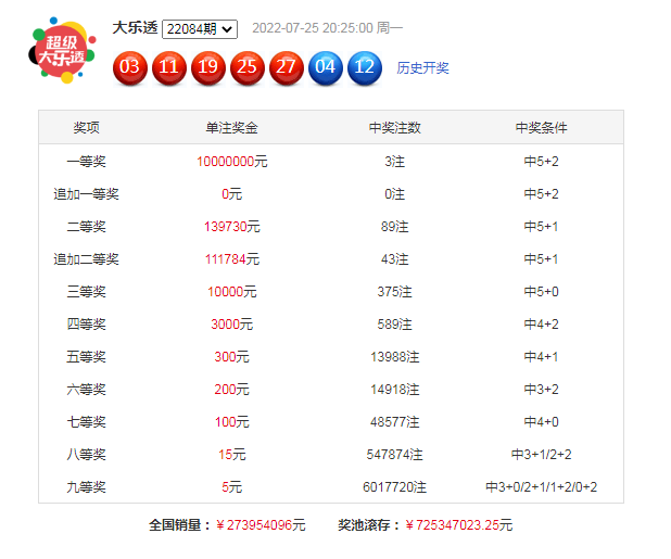 2022084期前区03 11 19 25 27;后区04 12。当期前区号码大小比为3:2,三区比为2:1:2,奇偶比为5:0。后区两码遗漏期数分别为0期和4期。