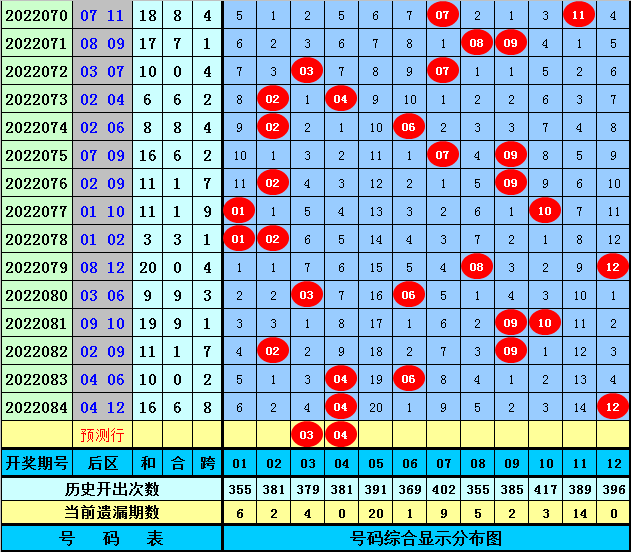 后区分析:上期后区奖号为04和12遗漏期数分别为0期和4期,目前后区遗漏5期以内的热码有7个:02、03、04、06、09、10、12,遗漏4期以上的热码有5个,本期后区适当关注重号出现,参考两码03、04。