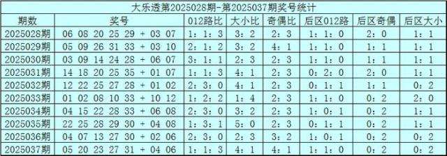 体彩大乐透第25037期奖号为:05 20 23 27 31+04 06,前区奖号012路比为1:1:3,奇偶比为4:1,大小比为4:1,后区2路号码轮空。