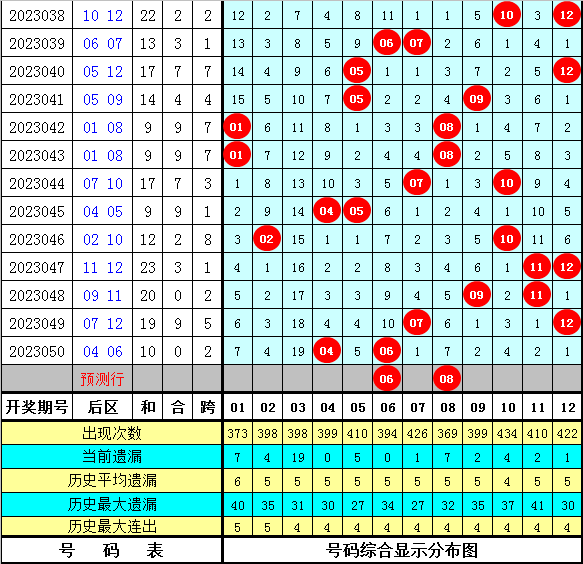 后区分析:后区上期开出奖号04 06,在最近15期开奖中奖,后区各号码频次分别为:号码07、10、12开出4次,号码05、08开出3次,号码01、02、04、06、09、11开出2次,号码03没有出现。本期预计后区在01、03、06、07、08、11之中出现,精选两码06+08。