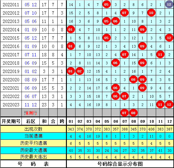 后区第一位分析:在历史第024期同期奖号中,后区第一位号码全部在01-11区段出现,其中该位号码012路比为4:7:4,奇偶比为6:9,大小比为4:11,本期第一位号码参考07。