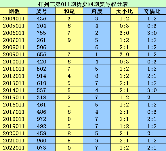 从2004年至今排列三已开出6431期奖号了,本期为排列三2023年第011期开奖,历史同期已出现19次奖号: