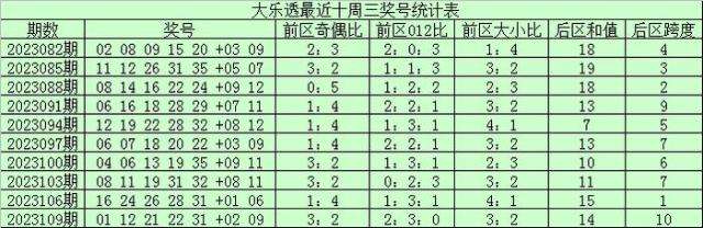 前区奇偶走势:上期前区奇偶比为3:2,上周三前区奇偶比3:2,最近十周三偶数号码略占优势,本期预计偶数号码再次走热,参考奇偶比3:2。