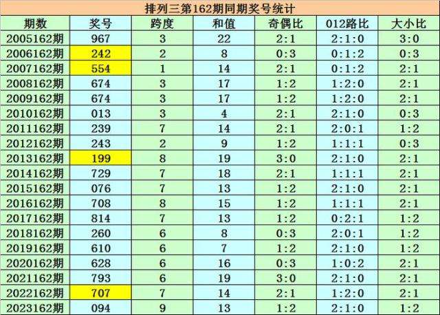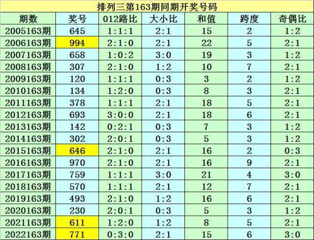 本期为排列三第2023163期开奖,开奖日期为:2023年6月22日,历史上排列三第163期已开出了18次奖号,历年同期开出号码分别为:645-994-658-307-120-134-378-693-142-302-646-970-759-570-493-230-611-771。