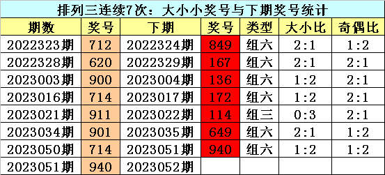 大小判断:上期排列三奖号为940,大小为:大小小,近7次大小为大小小的奖号为:712-620-900-714-911-901-714。