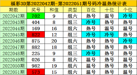 上期回顾:福彩3D第2022051期开奖奖号为:573,奖号类型为:组六,奖号冷温热态为:温号+热号+温号。