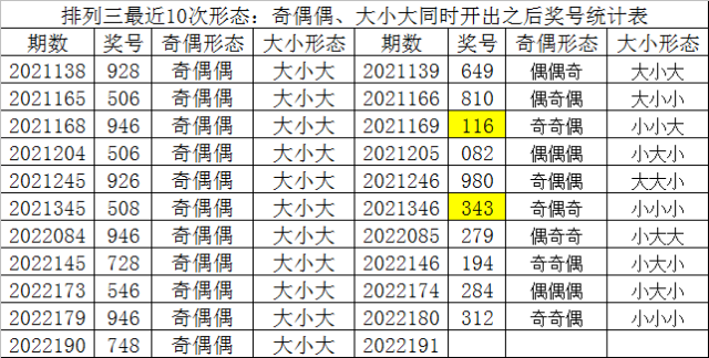 排列三最近10次同时开出奇偶形态:奇偶偶和大小形态:大小大时其奖号分别为:928-506-946-506-926-508-946-728-546-946-748,下期分别开出号码为:649-810-116-082-980-343-279-194-284-312,详细统计见下表: