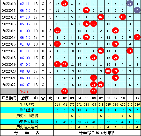 6、后区分析:后区上期开出一奇一偶组合,最近9期号码奇偶比为12:6,偶数号码走势较冷,本期适当关注偶数回补,注意全偶组合,两码参考02 06。