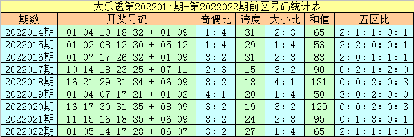上期回顾:体彩大乐透第2022022期奖号:01 05 14 17 28 + 06 07,其中前区五区比为2:1:1:1:0,奇偶比为3:2,大小比为1:4,和值为65,后区号码大小比为1:1,奇偶比为1:1。